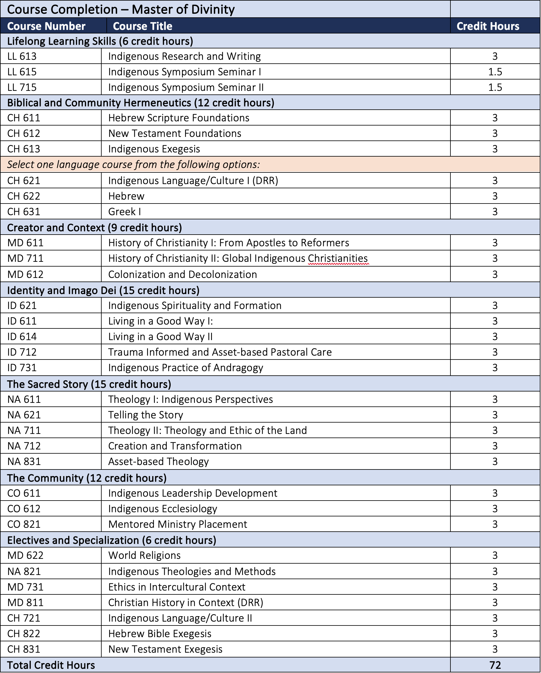 The Master of Divinity degree program encourages students to develop Indigenous and contextual approaches to biblical studies, theology and ministry practice in an integrated, community based program. The program is intended to equip Indigenous students that are serving or plan to serve as pastors, chaplains, youth ministers, or leaders in bi-vocational ministry that require specific ministerial focused skills. To this end, the new field experience practicum in a contextual church plant and/or historic contextual congregation, will provide a solid, mentored base for consolidating course-based learning.